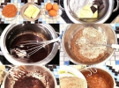 Шоколадную смесь взбить, постепенно добавляя яйца. Затем всыпать постепенно мучную смесь и перемешать.