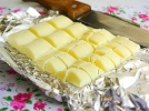 Белый шоколад порезать ножом на небольшие кусочки (дольку разделить на 4 части).