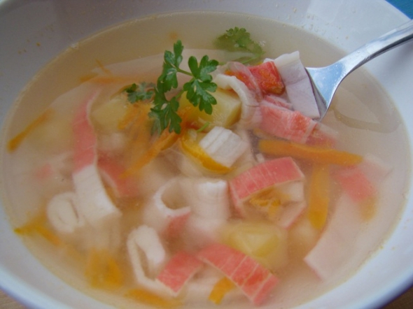 "Картофель режу кубиками среднего размера, как обычно на суп. Сначала провариваю ее потом бросаю промытый рис. За 10 мин до готовности высыпаю в кастрюлю давленый сардины и нарезанные поперек палочки. Они во время приготовления раскручиваются и внешне напоминают спагетти. Прежде чем за 5 -10 мин не надо, потому что на вкус будут никакие. Добавляю яйцо".