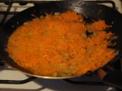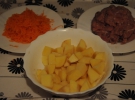 2-3 крупных картофелины хозяйка нарезает небольшими кубиками, промывают в холодной воде. Ставит кастрюлю на средний газ, когда закипает - добавляет картофель, солит. Чистит одну морковь и лук. Морковь трет на мелкой терке, лук мелко режет. На подсолнечном масле в сковороде пассерует лук, добавляет морковь. Готовую зажарку добавляет в суп.