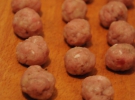 Из фарша скатывает плотные шарики одинакового размера. Шарики можно сделать маленькими - величиной с лесной орех, или большими, как кому нравится. Поочередно опускает фрикадельки в овощной суп. Готовит суп еще 10 минут, пока мясные шарики не поднимутся вверх кастрюли.