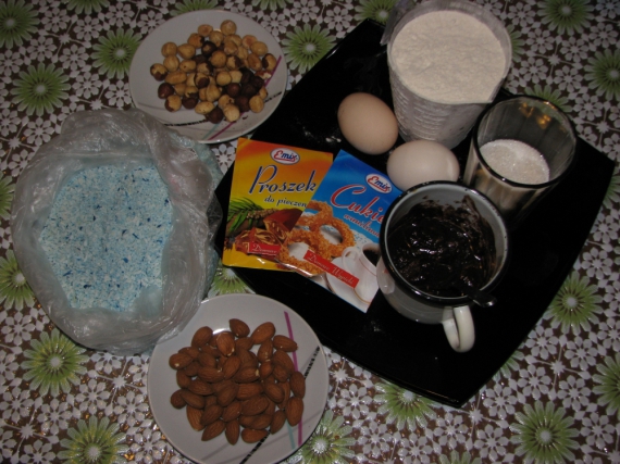 Сбивает 2 яйца и полстакана сахара, добавляет пачку ванильного сахара, столовую ложку порошка для печенья. Туда вливает шоколадную массу, сбивает. Добавляет стакан просеянной муки.