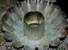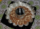 Через полчаса вынимает испеченный кекс. Переворачивает так, что кокосовая стружка выходит сверху, орешки - снизу. Посыпает выпечку сахарной пудрой.