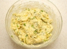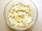 Сыр натереть на терке. Немного сыра отложить для того, чтобы потом посыпать сверху. Зелень мелко нарезать. Смешать в одной миске сухие ингредиенты.
