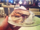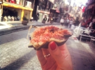 "Сэндвич, похожий на половину разрезанного батона, туда кладется скумбрия на гриле и овощи. К ним подают соленья в пластиковых стаканчиках: огурчики маринованные, капуста крупными кусками, горох, и все это заливается рассолом с добавлением свекольного сока - все розовым становится. Вся огромная набережная ест эти булки. Не знаю, как повара работают. Весь день на жаре жарят эту рыбу в лодочках на воде, их при этом качает".