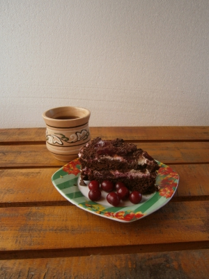 "Беру очень черный и настоящий. Никаких сладких плиток и "Аленок". Также делаю немного вишневого желе: провариваю стакан вишен без косточек с сахаром, процеживаю и сироп зажелатиниваю. Делаю желе в чашке, когда застынет, вынимаю его и режу на кусочки, украшаю ими торт. Но будет вкусно и без желатина. Главное выдержать торт ночь в холодильнике", - заверяет женщина.