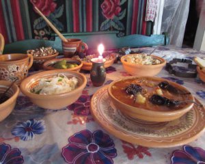 "Хозяева готовили традиционно 12 блюд. Обязательно была кутья из пшеницы, компот, кныши, студень из рыбы, квашеная капуста, борщ с фасолью, пирожки с сушеными грушами, калиной и тыквой, вареники с картошкой, маком, капустой и гречкой, деруны, пшенная каша и кисель. Также часто подавали квашенье - соленые помидоры, огурцы, яблоки и арбузы", - говорит она.