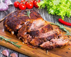 Натереть специями, чесноком и сушеными травмы мясо. Добавить горчицу и масло. Поставить свинину в рукав для запекания и скрепить края. Запекать при 200 градусах полчаса. Готовое блюдо подавать со свежими овощами и картофельным пюре.