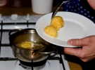 Как только масло закипает, Марина погружает туда поочередно шарики мороженого, обкатанные в крупе.