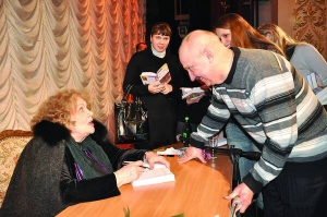 Чтобы ускорить процесс, Лина Васильевна просит дочь Оксану Пахлевскую записывать на книгах имена желающих, а сама только ставит автограф.