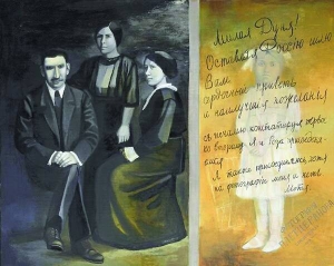— Над "Фамильным альбомом" работала весь прошлый и этот год. Каждую картину писала где-то месяц, — говорит Назаренко. На полотнах изобразила старые семейные фотографии, записки и открытки. — Моя мама и тетя стареют, уже не могут разглядеть старые фотокарточки. Когда перебирала семейные архивы, нашла письмо деда из ссылки в Сибири. Он писал бабушке: "Устраивай свою жизнь без расчета на меня". Дали 10 лет, потому что не донес об анекдоте, который рассказали при нем. Расстреляли в 1937-м. Бабушка всю жизнь его ждала. Я решила, что напишу большие полотна, которые они будут видеть.