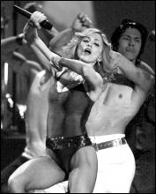 На сцену вышла и 47-летняя поп-дева Мадонна. Звезда впервые рискнула выступить после тяжелой травмы, полученной после падения с лошади. Она спела первый сингл "Hung Up" ("Я зависима") из нового альбома.