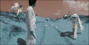 Большинство фото сделано на песках, только несколько — между деревьями. Небо на снимках Афанасьева — светло-красное, а песок — белый, словно снег. Это делает персонажи более четкими. На одном снимке — несколько мужчин и женщин сидят под деревом. Все в женских комбинациях. На соседней работе — около двух десятков людей в разных позах стоят на поле, а среди них в черном с косой блуждает Смерть.