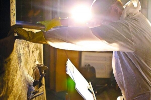 В 20.00 возле облупленного цеха собрались около ста человек. Большинство - студенты. Их пускают за половину стоимости билета - 15 грн. Из цеха слышится электронная органная музыка. Зрителям раздают фонарики. Отправляются в лабиринт из белой атласной ткани, которая ведет к местам рядом с остатками станков.