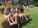 На экране транслируют клип "История Украины за 5 минут" группы "Танок на майданіКонго". Дети уселись на соломенные тюки. На стульях перед сценой остались те, у кого есть зонтики от солнца. Остальные смотрят на скамейках под деревьями.