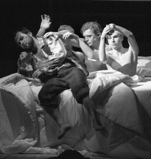 Актеры поют лежа, становятся на колени, ползают по сцене. Поют по-немецки. Над сценой идут украинские титры.