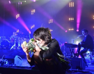 - У вас Одесса как наш Питер - всё сами организовывают, а Киев - как Москва: нужно самим работать. Что ж, мы не против, - говорит Земфира на сцене. Она в темной юбке и черной кофточке.