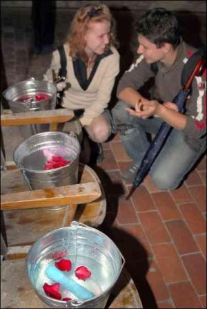 — Все достаточно культурно и красиво, — добавляет Богдан. — Даже это... — смущенно говорит, показывая на экспонаты художника Тараса Беняха. Вдоль стены стоят наполненные водой оцинкованные ведра, в которых лежат лепестки роз и разноцветные вибраторы. Искусственные члены работают, образовывая на поверхности воды небольшие волны.