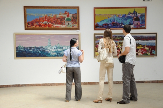 На больших четырехметровых гобеленах Слепцова - Киево-Печерская и Почаевская лавры, Андреевский спуск, Ярославов вал, Хотинская и Каменец-Подольская крепости, руины замка над Днестром, церкви и пейзажи.