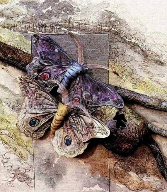 Любимая тема для объемных картин Аннемиеке Мейн это природа. Художницу интересует флора и фауна, в частности, насекомые и птицы, по которым она любит наблюдать. Она сначала изучает их поведение и привычки в различных ситуациях, рассматривает картинки в книгах по биологии и зоологии, а затем с научной точностью воспроизводит в эскизах то, что увидела, и переносит это на ткань.