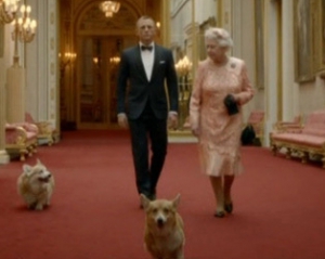 По сюжету Ее Величество якобы совершает прыжок с парашютом на арену Олимпийского стадиона вместе с исполнителем роли агента 007 Дэниелом Крейгом.