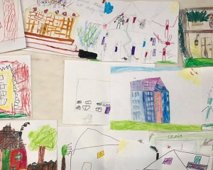 Художница Дарья Кольцова собирает детские рисунки для того, чтобы оклеить ими дом, сделанный по детским эскизам. Эта арт-инсталляция будет представлена на выставке "Как тебя зовут?" Посвященная проблемам семей переселенцев. Проект организован ЮНИСЕФ и правительством Германии.