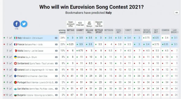 Букмекеры продолжают делать прогнозы и ставки на победителя Евровидения-2021.