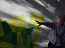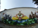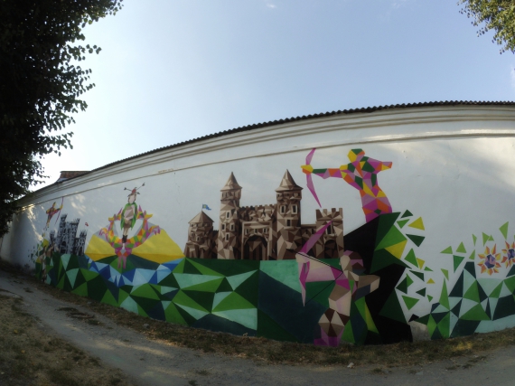 "За две недели до фестиваля придумали идею. Захотели рисовать Каменец-Подольскую крепость и братьев Кориатовичей (князья, правившие в Подольском княжестве и Закарпатье в XIV веке. − Gazeta.ua), которые охотились на оленей. А вторая история Вильгельма Телля, которому пришлось попасть в яблоко на голове сына. Нарисовали в стиле поли-арт. Работали четыре человека − заняло целых три дня. Приехали за неделю до начала фестиваля", − говорит художник из Одессы Юрий Шеховцов. Вместе с коллегой Денисом Белым 2 сентября дорисовывают панно.
