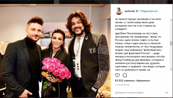 Пользователи сети раскритиковали фото украинской певицы Ани Лорак с российским певцом Сергеем Лазаревым и исполнителем, продюсером Филиппом Киркоровым. Снимок сделали после презентации концертной программы Ани Лорак "Дива" в российском Санкт-Петербурге 25 февраля. Певица выложила его в Іnstagram с подписью: "Спасибо моим дорогим, любимым друзьям @fkirkorov, @lazarevsergey, которые специально приехали ко мне на шоу "Дива". Это был настоящий сюрприз и подарок!"