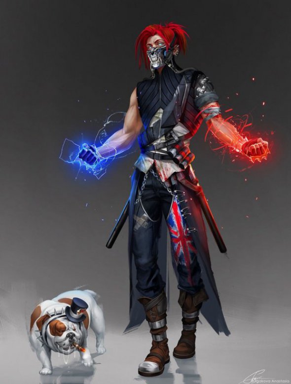 "Меня попросили не делать Англию слишком стереотипной, с чаем, королевской названием и Аббатством Даунтон. Моя Англия - свежая, молодая с дикой панк-культурой и рок-музыкой.Несмотря на то, что это Англия, а не Великобритания, я выбрала цвета Джона Джека, поскольку они более известны. Прическа дикая и красная, потому что он панк. Предпочитает ближний бой с кулаками, поэтому использует латунные суставы. Его руки могут выпускать горячую и холодную энергию, но они никогда не перемешиваются (две шутки)".