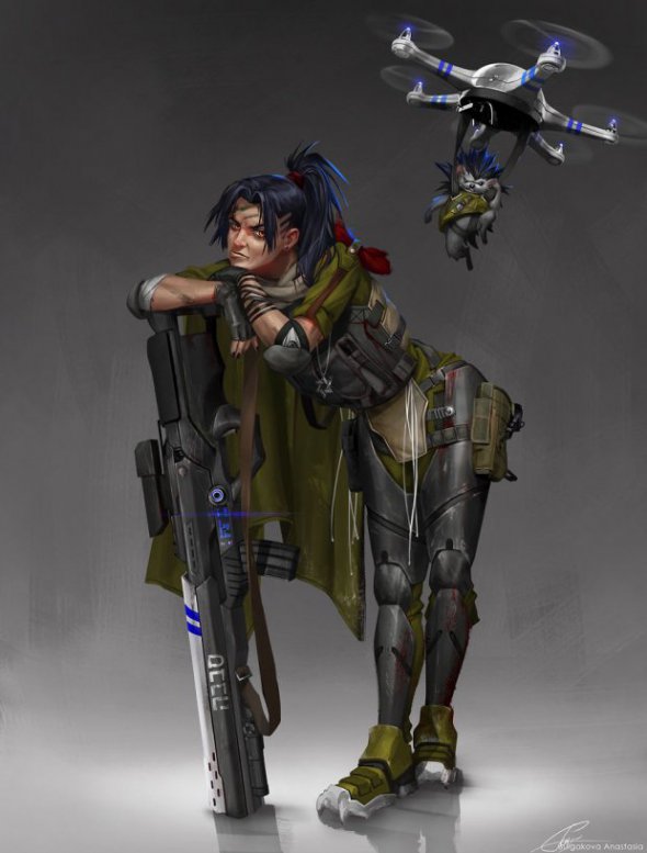 "Немного наивная и идеалистическая. Очень привлекательная и харизматичная, легко переманивает других на свою сторону. Преследует свои цели, не учитывая морали или последствий. Ее главная цель - выжить. Она носит кожаные доспехи, поскольку предпочитает чрезвычайно длинные бои. Кибернетические руки и ноги дают ей необычайную скорость в бою. Она убийца ", - написала художница.