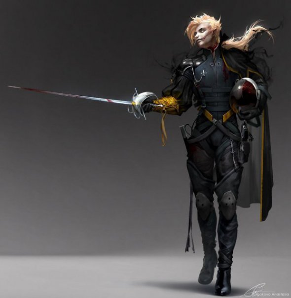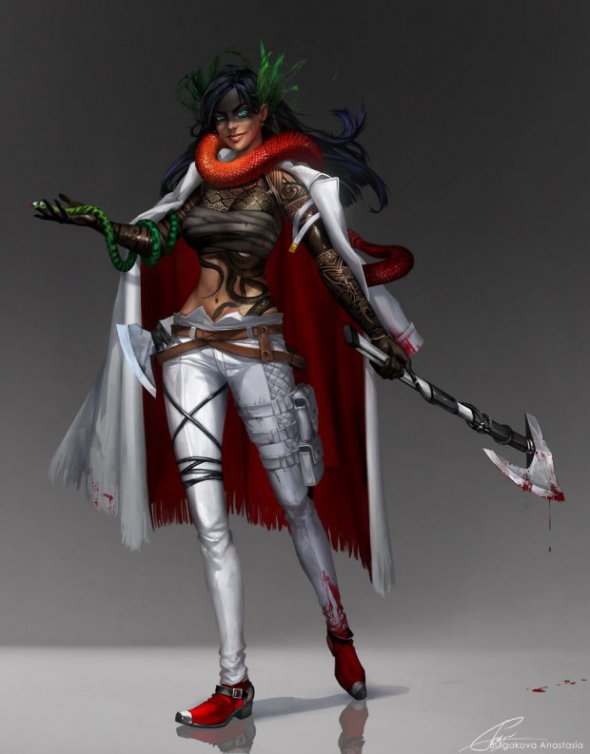 "Холодная, прямолинейная и с дипломатическими навыками канализационного стока, - написала художница. - Носит гламурную броню. Всегда. Поскольку всегда находится на войне ".