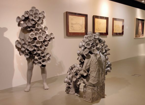 Скульптуры людей, из тела которых торчат лейки, посвященные отчаяния молодого поколения с периферии. Оригинальное название композиции - Травази, от травазара, что означает разливать, проливать. Таким образом художник рассказывает, как мы контактируем с этим миром. Что-то берем и отдаем, то есть проливаем. Эти скульптуры изображают людей, которые мало общаются между собой, потому возвращены в разные стороны.