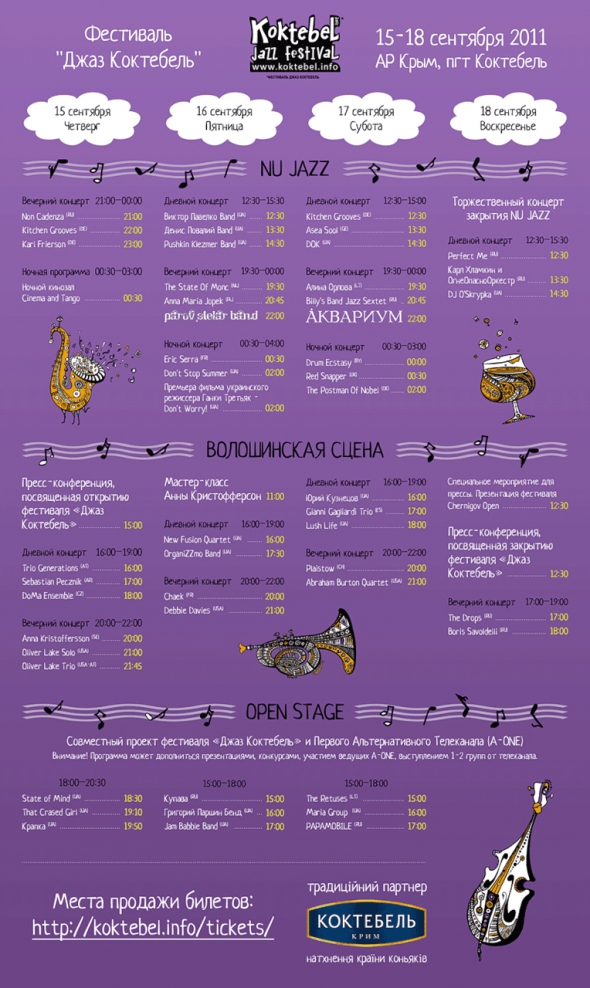 На Волошинской сцене под открытым небом, в саду дома-музея Волошина, гранды джазовой музыки исполнят современный европейский, американский, а в этом году и украинский джаз. Дневные и вечерние концерты будет вести неизменный куратор этой сцены Алексей Коган.