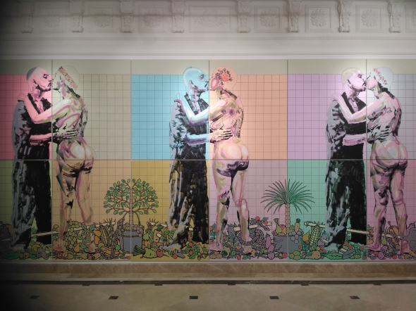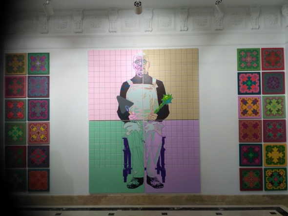 Картина "Счастье в труде" - автопортрет Олега Тистола. Изобразил себя с булавой в одной руке и с мастерком в другой. "Сфотографировал себя в наиболее плачевном виде. Затем нарисовал. Хотел показать все величие и ничтожность художников, - рассказывает Тистол. - Мы - люди будущего и нацелены в вечность. Остаемся известными благодаря своим работам. Но положение тяжелое. Социально мы - никто, а в мире культуры - значим много. Булава - символ того, что мы сами себе власть. Шпатель - чтобы показать тяжесть и значимость нашей работы, - рассказывает автор. Картина нарисована на четырех полотнах, которые вместе образуют автопортрет художника. - Люблю так рисовать. Отдельными элементами картину легче транспортировать. Можно разложить ее на пазл. Так подчеркивается несерьезность изображаемого", - продолжает Тистол.