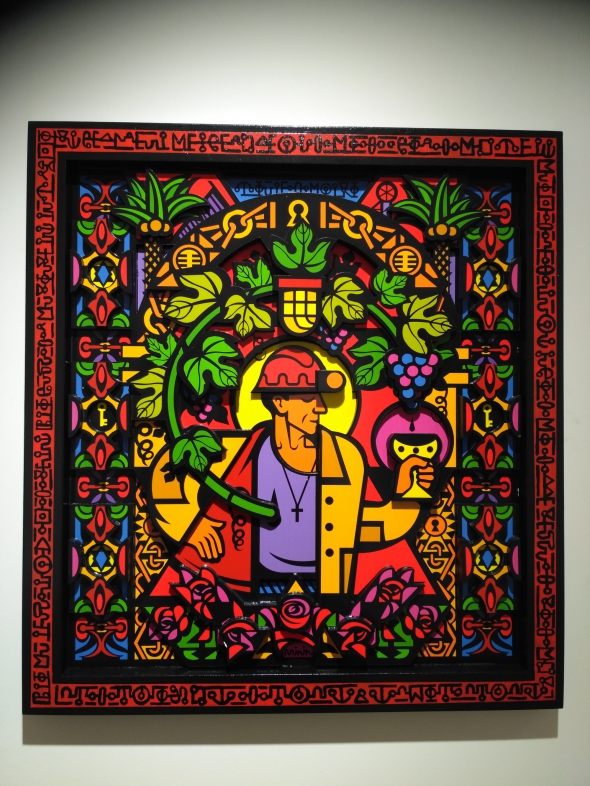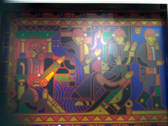 Витражи расположил в окнах галереи. Это декоративно-монументальное панно на тему взаимодействия шахтеров и религии. Разделено на части по количеству окон. "Шахтеры - верующие люди. В основе одной композиции - попадание шахтеров в рай. В другой изображено, как они обращаются к Богу", - рассказывает автор.