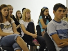 В зал входит десяток школьников. Преимущественно девушки. Садятся группой на задних рядах.
