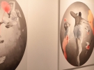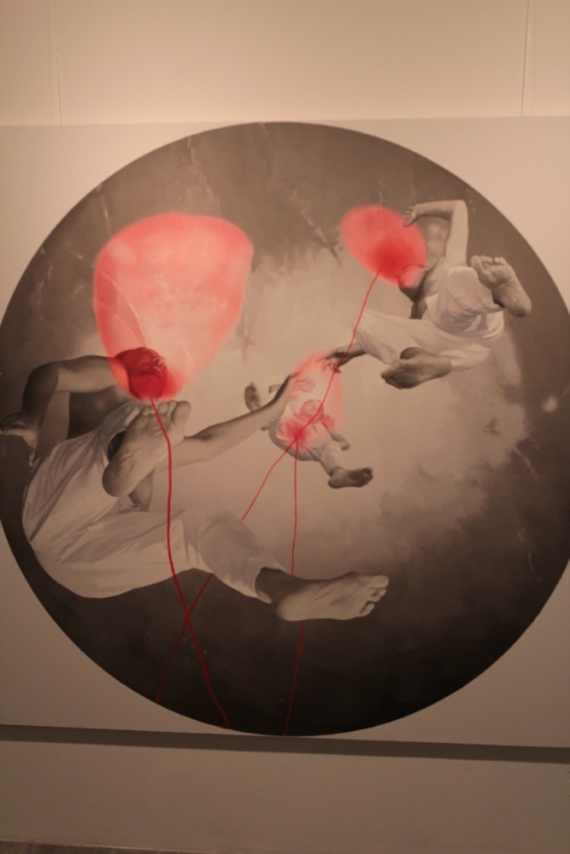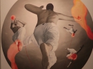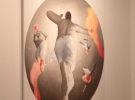 В другом зале галереи - три большие картины людей, которые летят в сером пространстве.