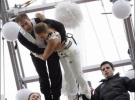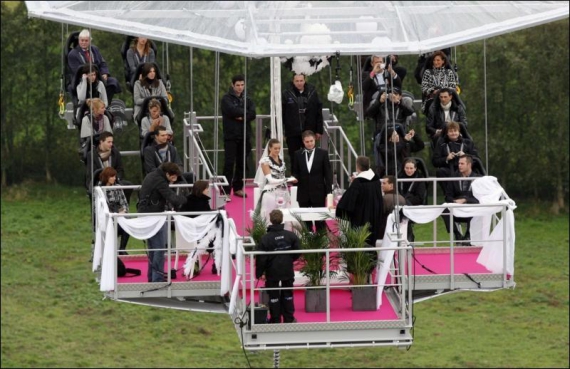 Бельгийская пара Сандра Инс и Джерон Кипперс сыграли свадьбу на платформе, подвешенной приблизительно на 40 метров над землей в бывшей военной части в Синт-Труиден, Бельгия. После торжественной части праздника молодожены прыгнули з банджи. "Свадьба в небе" - это новая услуга, которую предлагают бельгийские компании и теперь она доступна в 25 странах.