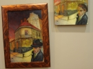 Привлекает внимание картина художника, где изображен известный писатель Бруно Шульц в шляпе на углу улиц. Рядом - та же работа, но Шульц без шляпы.