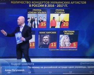 Российский "Первый канал" сегодня во время прямого эфира взялся считать количество концертов украинских исполнителей на территории РФ. Первое место в рейтинге занимает группа "Океан Эльзы".