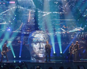 На сцене во время выступления группы стояла большая символическая голова, с которой лучами лился свет в зал на припеве.