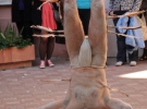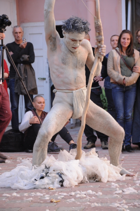 Его эпатажный перформанс собрал более сотни зрителей. Художник в накидке из перьев, весь в белой краске, которая покаривала его тело полностью. Из одежды на себе имел только тканевую повязку на бедре. Перфомер более 20 минут экспериментировал с острым ножом, веревками, импровизированным луком и черпаками из пищи. В середине выступления он закурил и прицепил прищепки с перьями к своему телу. Затем с железной ручной пилы и ножа сделал птицу и исчез со двора театра.