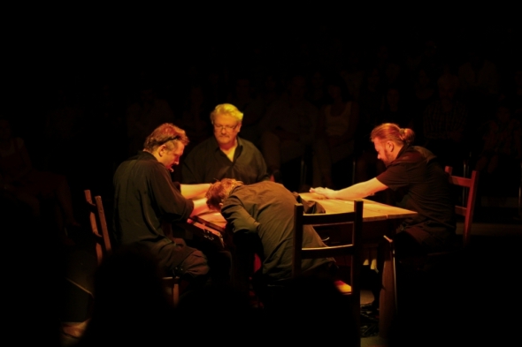 Их аудио-спектакль "Столик" длится около часа. Все четверо музыкантов одеты в черное. Софиты подсвечивают центр стола. Шорох, постукивание, пересвист голосом, удары, скрежет вилкой выливаются и в джазовую импровизацию, и в древний этнический перепев, понятный в любой стране мира.