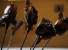 Больше всего посетителей заинтересовали картины с мухами, прилипших к клейкой ленте, работы с яичной скорлупой, розы из остатков рыбы, засушенные мыши и кошки, обрезки ногтей.