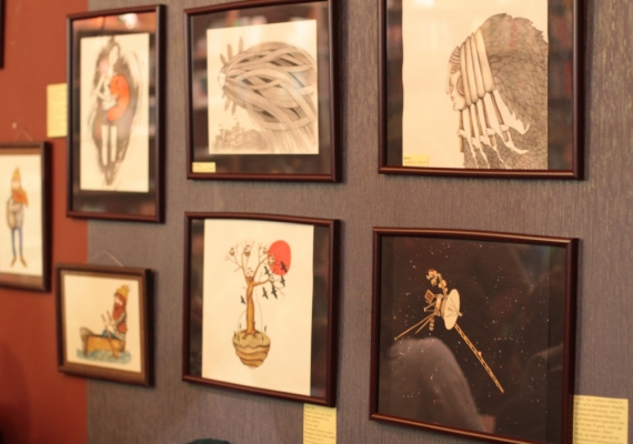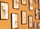 Одна из стен в зале кафе полностью завешена цветными рисунками птиц. Серию работ художница назвала "Внутренний "вирій".
