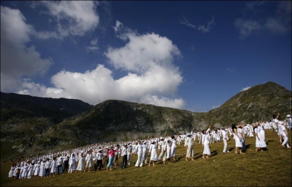 Белые браты и сестры сходятся на полях между озерами горного массива Рила, одетые в белую одежду, чтобы выполнить танец под названием Паневритмия.