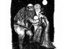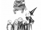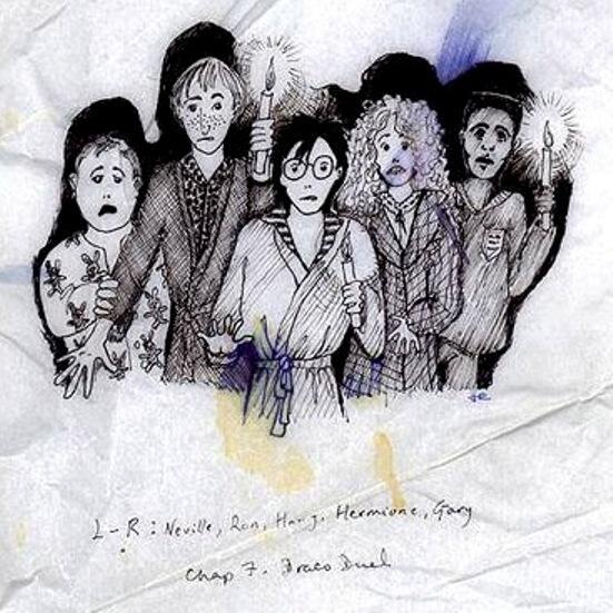 На черно-белых рисунках изображены главные действующие лица книги Гарри, Рон, Гермиона, Невилл и мальчик Гэри, известный по книгам как Дин Томас.