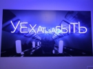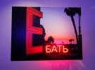 Одна из представленных на выставке работ - фотография мужчины в кепке, который спускается в метро на эскалаторе. На ней синяя неоновая надпись "УехатьЗабыть". На другой работе - пейзаж Санта-Барбары с большой буквой "Е" и неоновой надписью "бать".