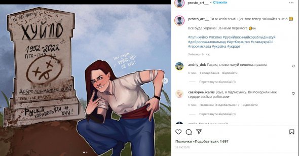 За время войны художница создала иллюстрации с казаками и казачками, которые имеют современные элементы одежды, украшения. На одной из иллюстраций изобразила надгробие Путина - год смерти 2022-й.